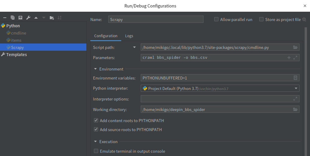 (5)在 Parameters 里面填入 Scrapy 的参数:crawl bbs_spider -o bbs.csv;