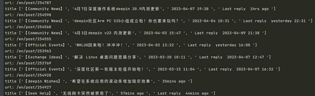 跑完之后,终端就会有输出爬取到的帖子信息:
