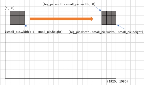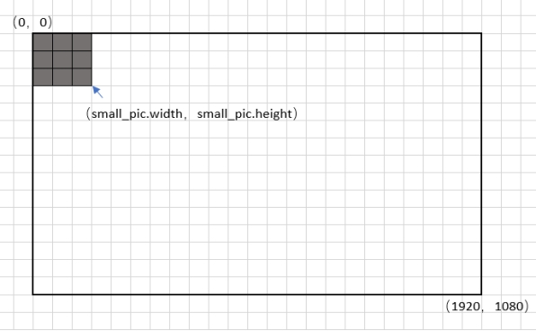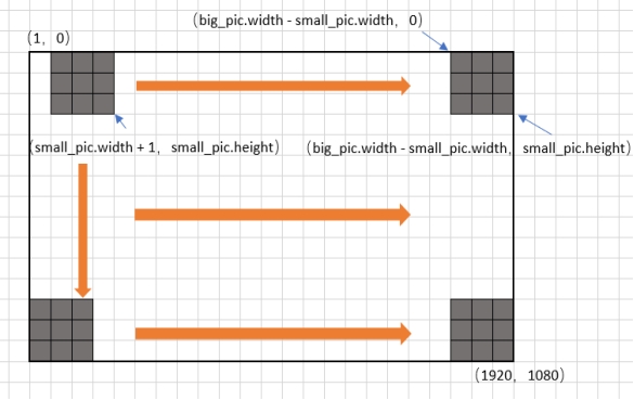 (2)如果在大图的(0,0)对应的所有小图的RGB值不相等,则移动到下一个坐标点(1,0),同样匹配小图里面所有的坐标点(0,0)—(small_pic.width,small_pic.height)