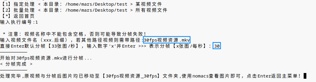 - 执行子菜单【编号1】—— 输入监控名称 —— 输出自定义帧率30 ** —— 完成分帧(见插图)**