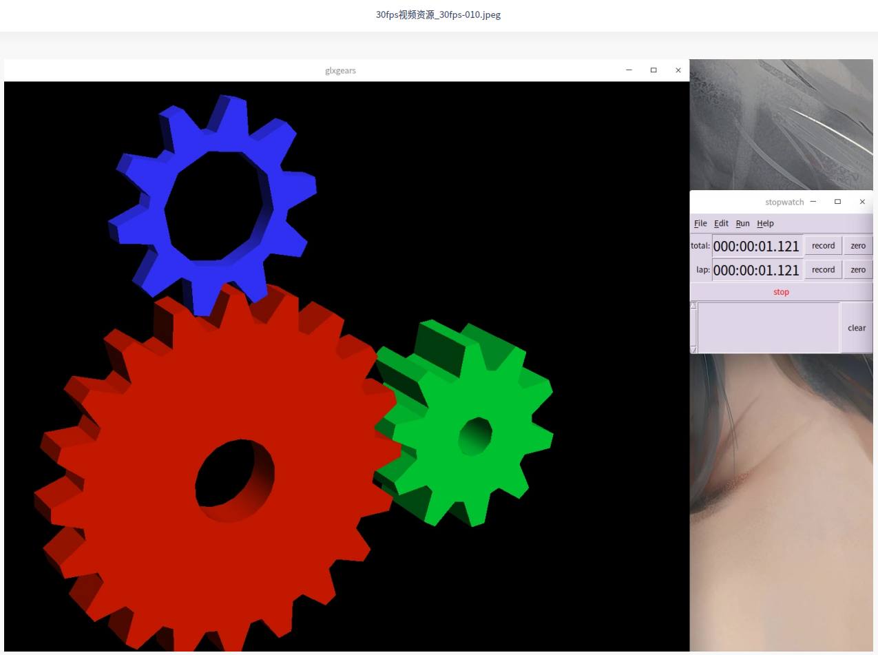我们无法保证每个视频资源都没有重复帧,那么我们可以自己制作符合要求的视频资源,这里可使用显卡FPS测试工具glxgears,运行glxgears会产生3个不同转动的齿轮,因为开启了垂直同步所以齿轮动画稳定在60FPS,通过视频录制软件录制齿轮动画为不同FPS资源:30FPS、49FPS,这些资源作为测试数据完美解决视频本身出现重复帧的情况。