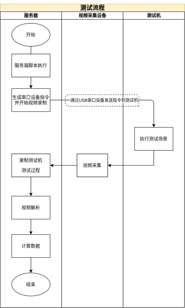 通过串口设备,在服务端模拟鼠标键盘操作,通过USB接口发送给测试机,使测试机执行响应的指令;另外,通过视频采集设备,将测试机的视频信号输入到服务端,由服务端录制整个操作过程,并完成视频解析;最后通过机器学习,自动查找首尾帧并计算结果,将结果汇总并呈现出来。