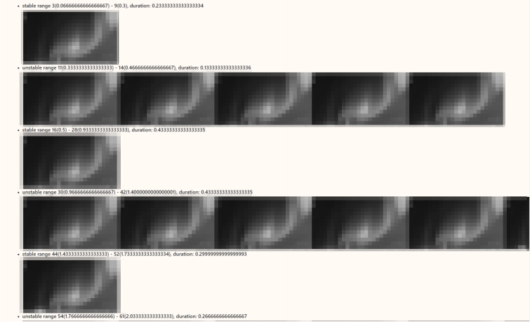 通过视频解析工具,将录制的视频分解为连续的图片。并通过计算前后图片的相似度,将所有图片划分为多个稳定阶段(静止画面)和不稳定阶段(连续变化过程),如图(四)所示: