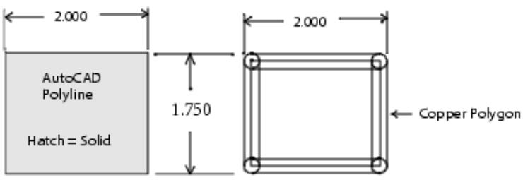 要在 AutoCAD 中定义一个正确转换为铜多边形的对象,请创建一个不自相交的闭合多段线并指定实心填充类型。如果以这种方式创建多边形,它将在 SailWind Layout 中转换为铜多边形(图 24)。此外,铜多边形在 SailWind Layout 中的创建方式使得多边形的外边缘与 AutoCAD 中形状的边缘对齐,确保整个形状的尺寸和检查正确。下图演示了此转换。