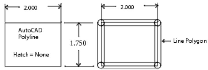 如果在 AutoCAD 中创建没有填充的多边形,该多边形将在 SailWind Layout 中转换为 2D 线(图 25)。在这种情况下,2D 线的中心线与 AutoCAD 中形状的边缘对齐。下图演示了此转换。