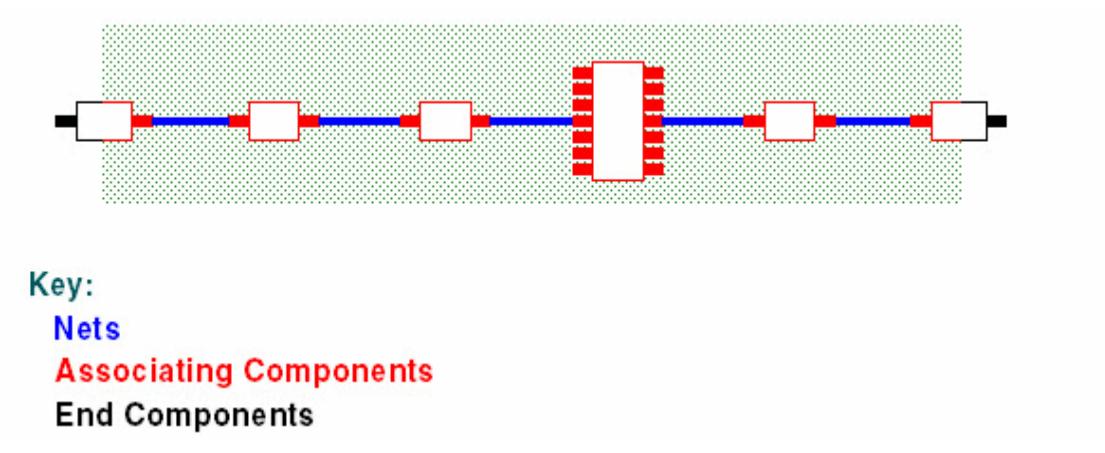 您可以将由分立元件连接的网络阵列关联起来,创建一个电气网络,您可以像对单个网络一样对其应用长度、差分对和匹配长度规则。电气网络的长度由组成它的网络和分立元件的长度总和构成。