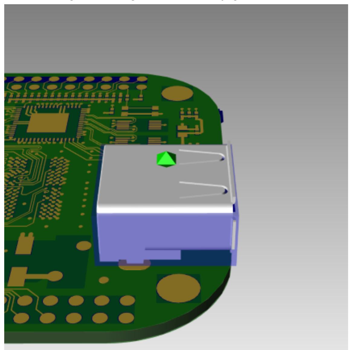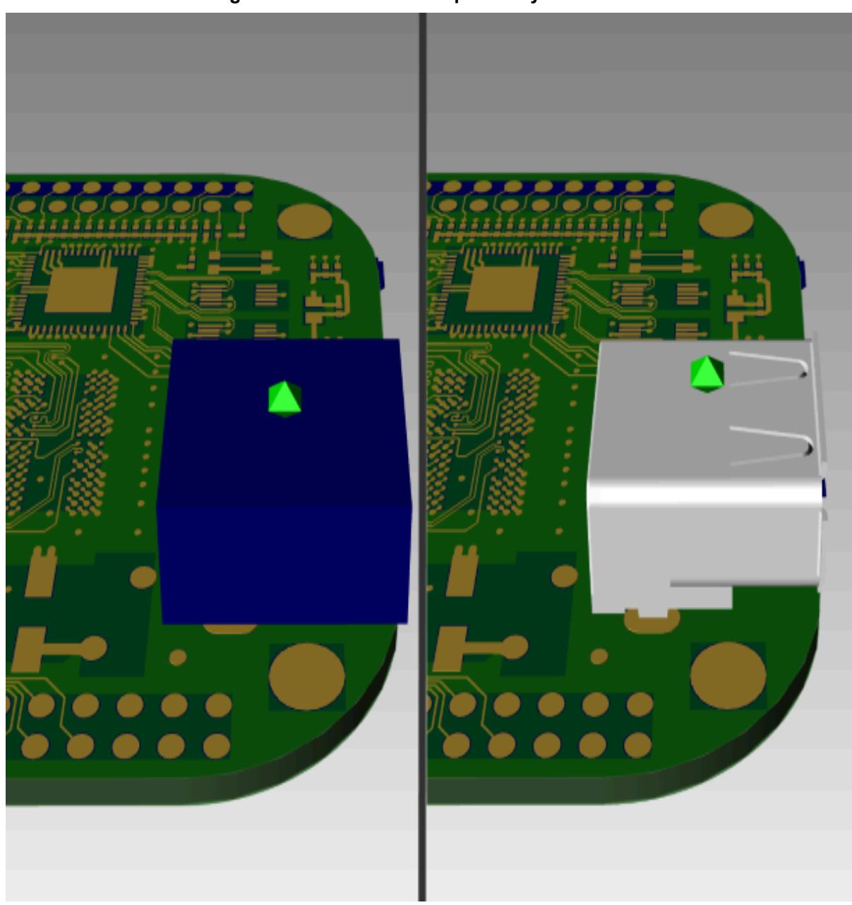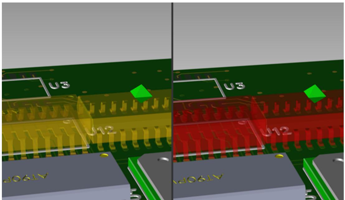 根据需要定位 PCB 元件。在定位元件时,元件会改变颜色(您可能需要将光标悬停在元件上片刻)以指示 3D 间距违规,如下所示: