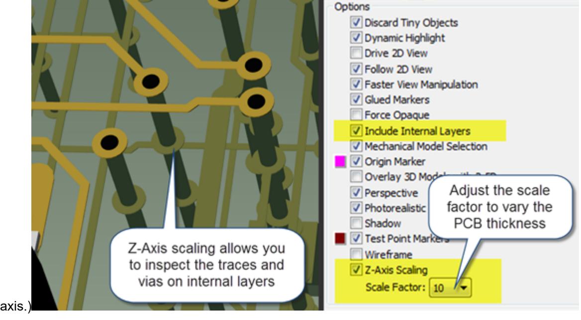 选择 Z 轴缩放复选框还会显示单独选择"包括内层"复选框时不可见的内层过孔筒。