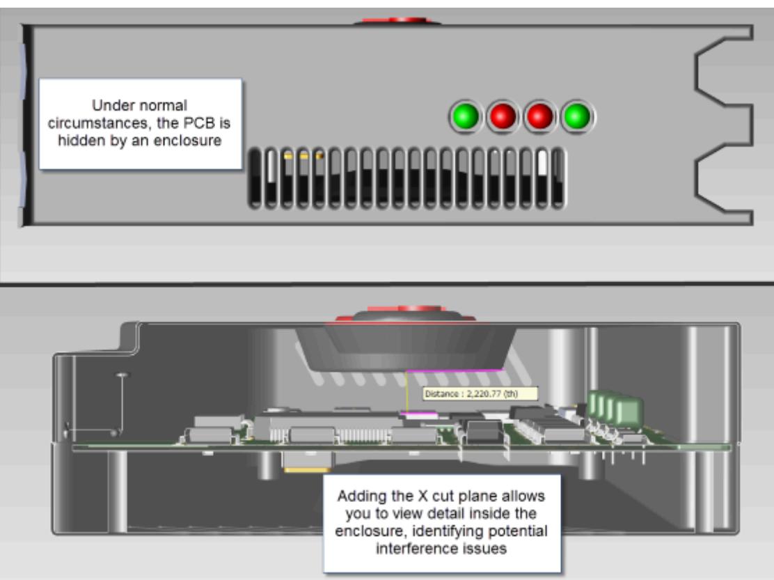 在 SailWind 3D 窗口中创建横截面"剖切"视图,以查看 PCB 元件与机械装配体或外壳之间的配合等细节。