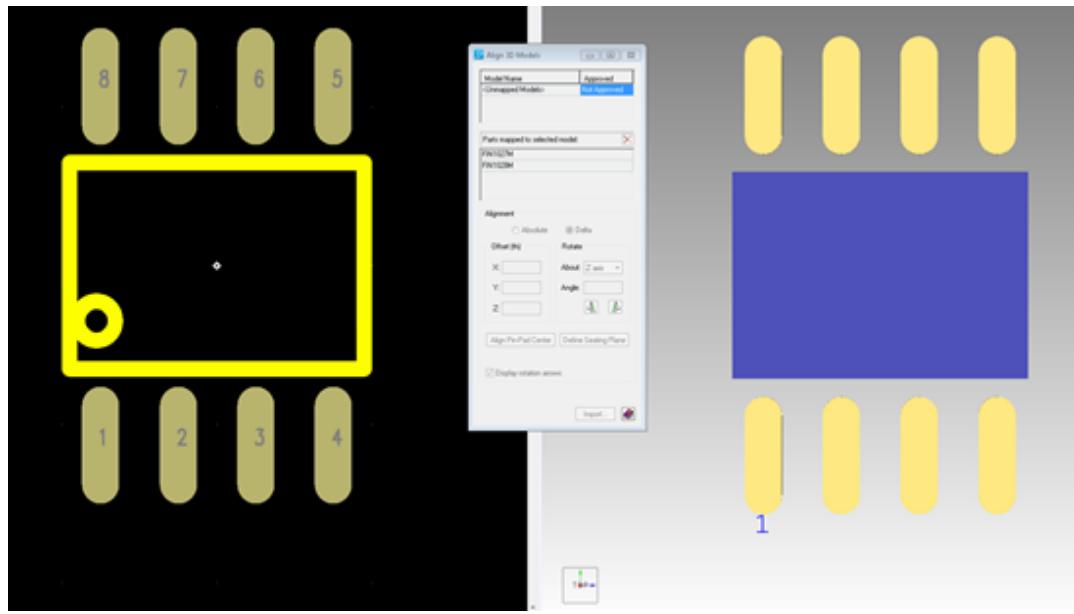 根据需要旋转或重新定位导入的 3D 模型,使其与封装焊盘正确对齐,如下所示: