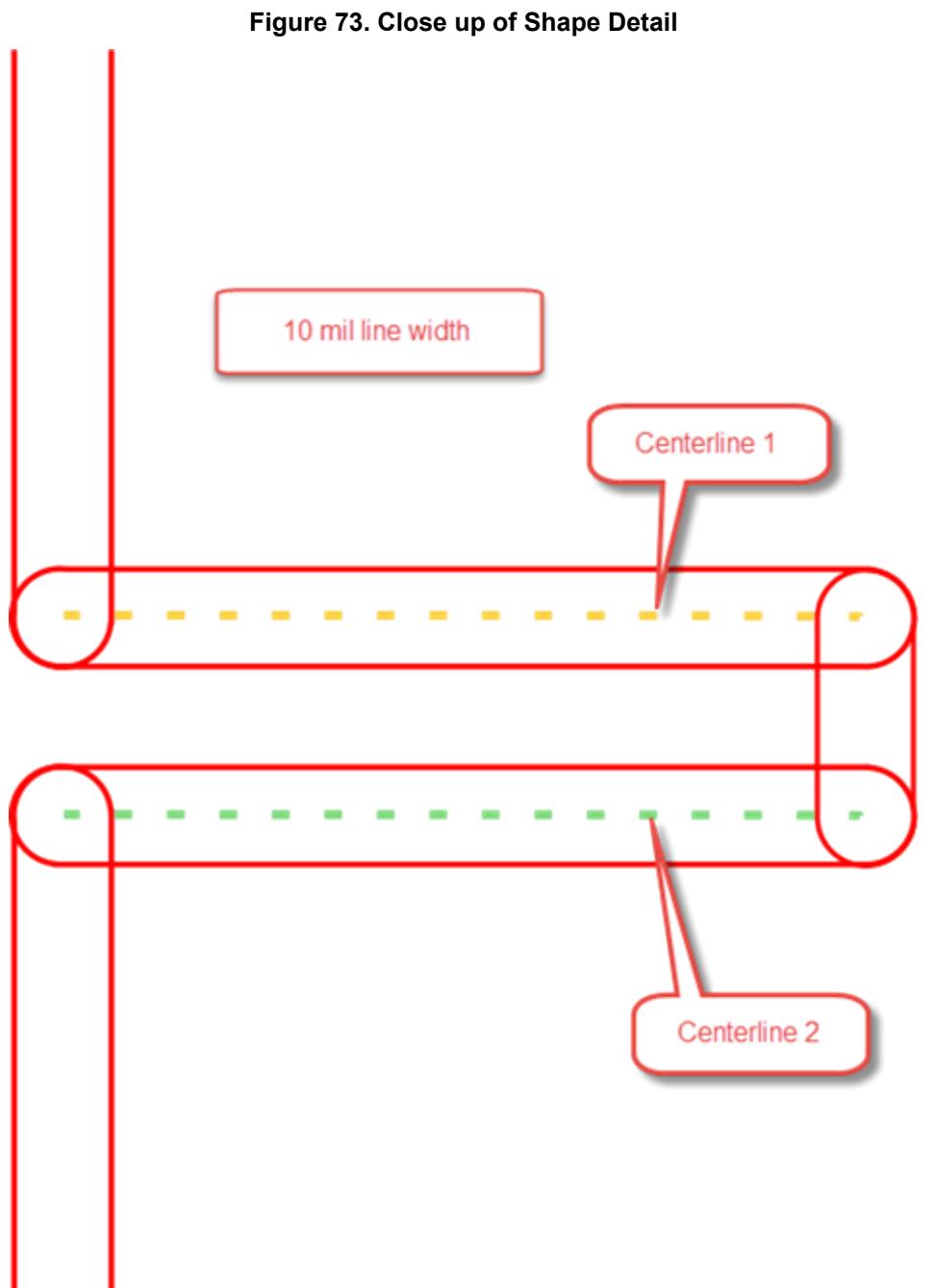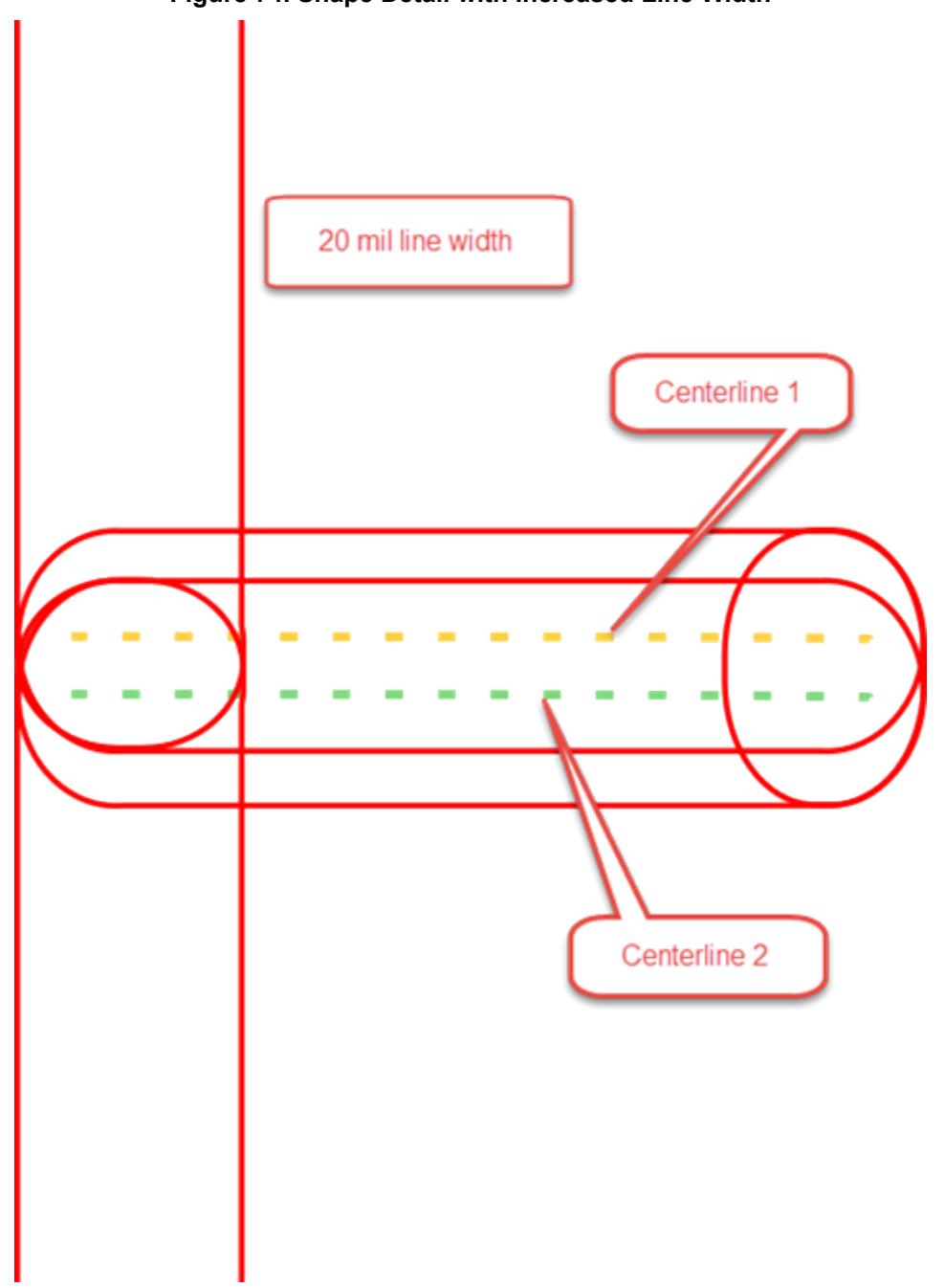 您可以根据设计需要设置线宽;然而,随着宽度增加,形状分辨率降低。参考前图中的示例,随着铜箔形状边框线宽的增加,线条的外边缘保持原位,内边缘向内扩展。结果如下图所示。