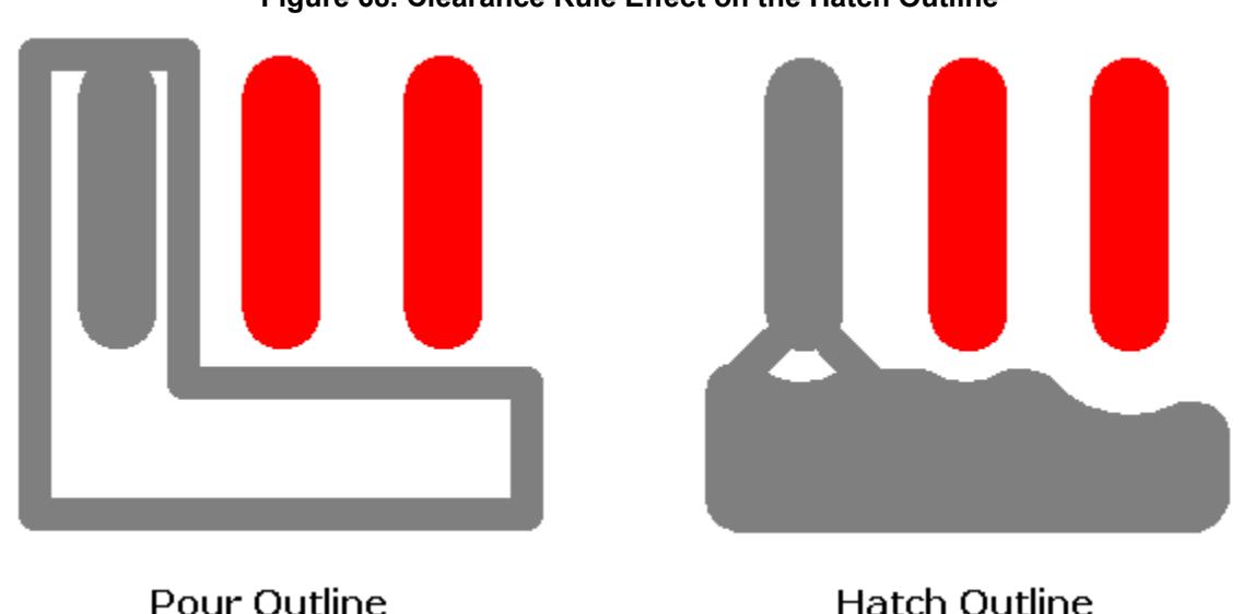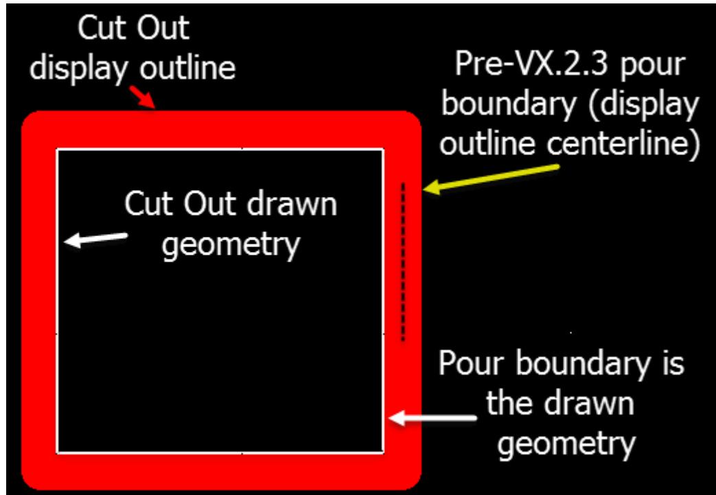 从 VX.2.3 开始,铜箔灌注到完成的挖空区域边框的内边缘而不是中心线。在 VX.2.3 之前,挖空区域会增长线宽的一半,因为铜箔会灌注到其中心线而不是作为预期边界的内边缘。有关更多信息,请参见"创建覆铜平面挖空区域"。