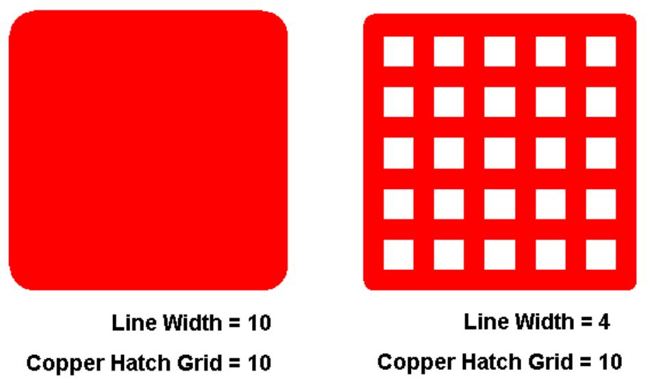 形状可以用铜箔以不同程度的填充直至实心图案进行灌注。默认情况下,当您灌注形状时使用的图案由选项对话框中两个设置的相对值决定: