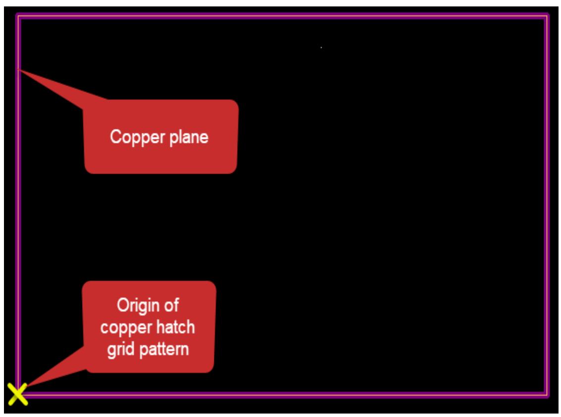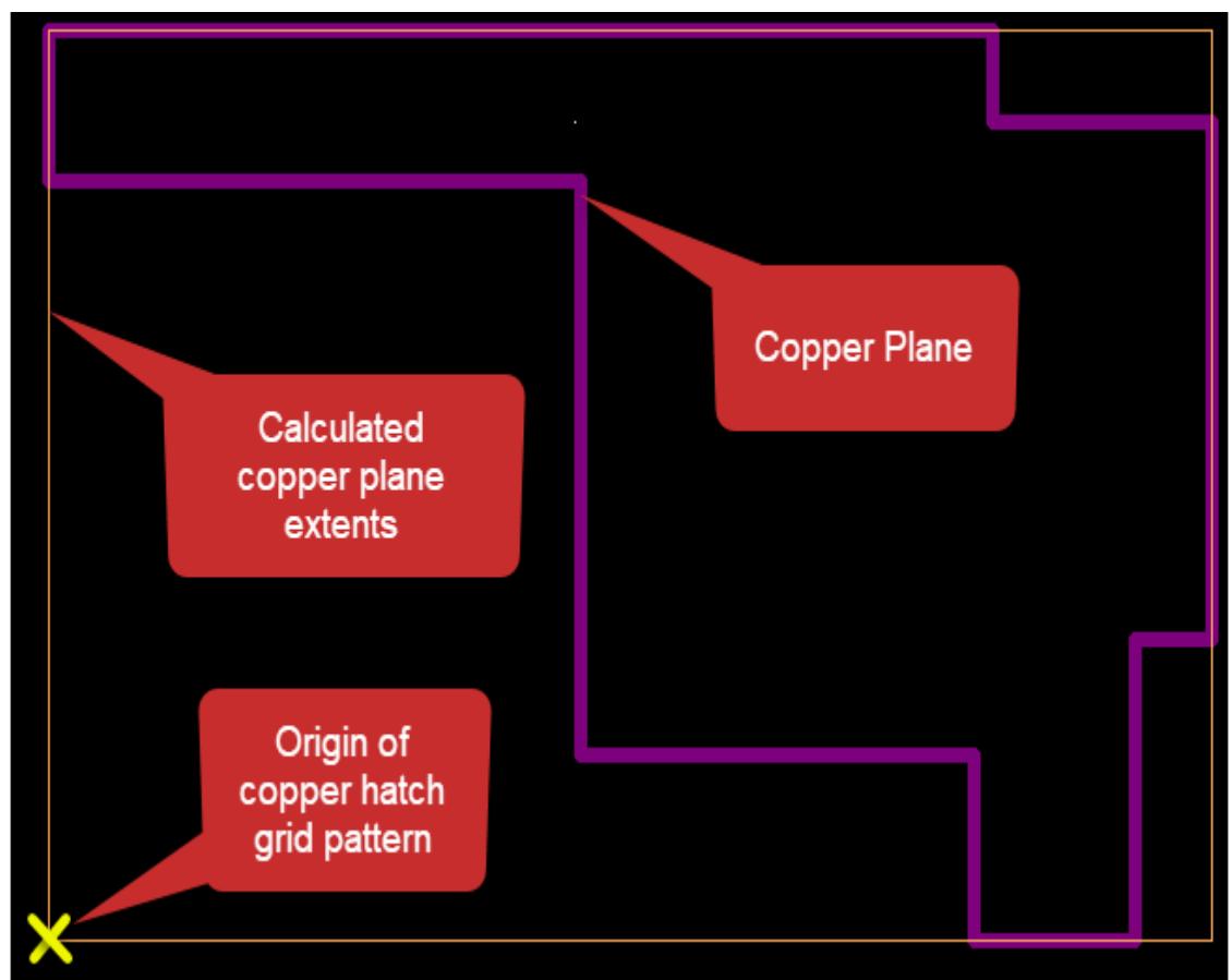 填充格栅图案的原点由围绕覆铜平面形状范围的假想框定义。范围框减少覆铜平面形状线宽的½,填充格栅原点放置在范围框的左下角。对于简单的矩形覆铜平面形状,填充格栅原点将位于形状的左下角。对于更复杂的形状,范围的左下角可能是覆铜平面形状外部的点。这不是覆铜平面形状的原点,只是覆铜平面填充图案的原点。