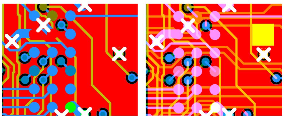 透明模式下可同时查看多个层上的走线,显示可能隐藏在当前活动层下的障碍物。透明模式开启时,会以第三种较浅颜色显示走线重叠、走线与元件边框重叠、铜与走线重叠。重叠颜色由分配给走线的颜色决定。透明模式关闭时不显示重叠。