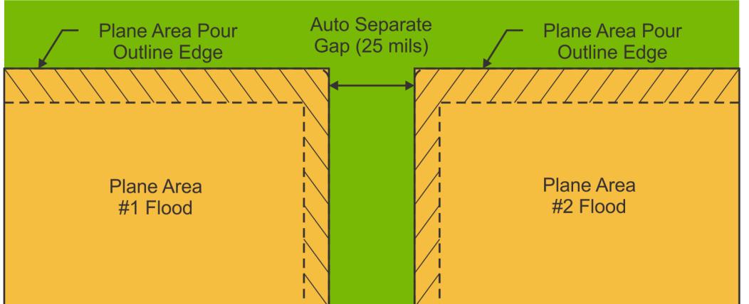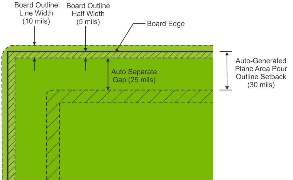 示例: 如果板框宽度为 10 mil,自动分离间隙设置为 25 mil,则产生的平面区域浇注边框退缩距离将是自动分离间隙值(25 mil)加上线宽度值的一半(5 mil),总共距离板边缘 30 mil。
