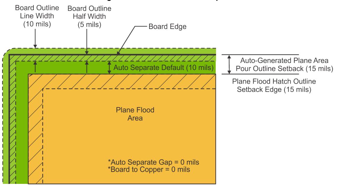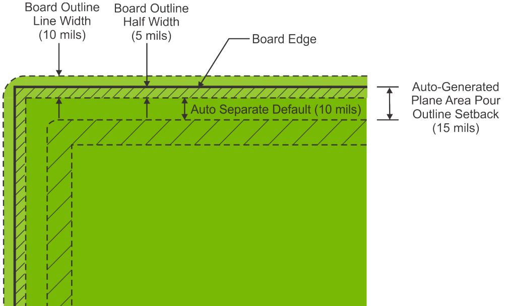 此退缩距离是从用于绘制板框的线的内边缘测量的。由于板边缘位于定义板框的线的中心,此线宽度的一半在板边缘内部,因此产生的平面区域浇注边框退缩距离是自动分离间隙指定的值加上用于绘制板框的线宽度的一半的总和。