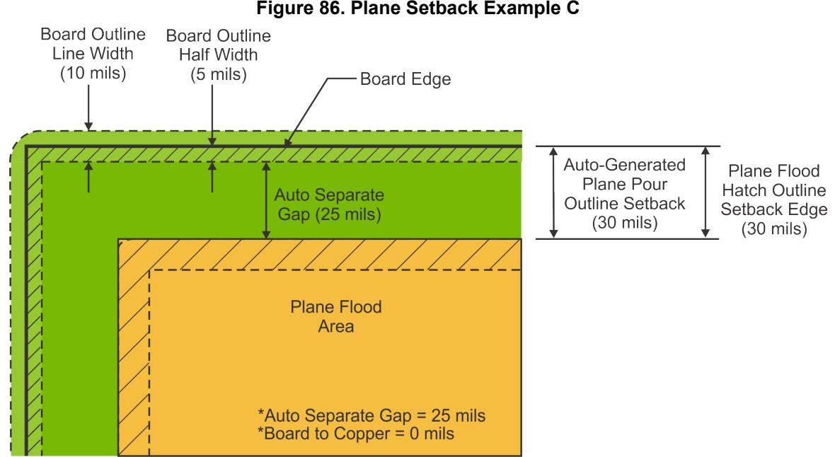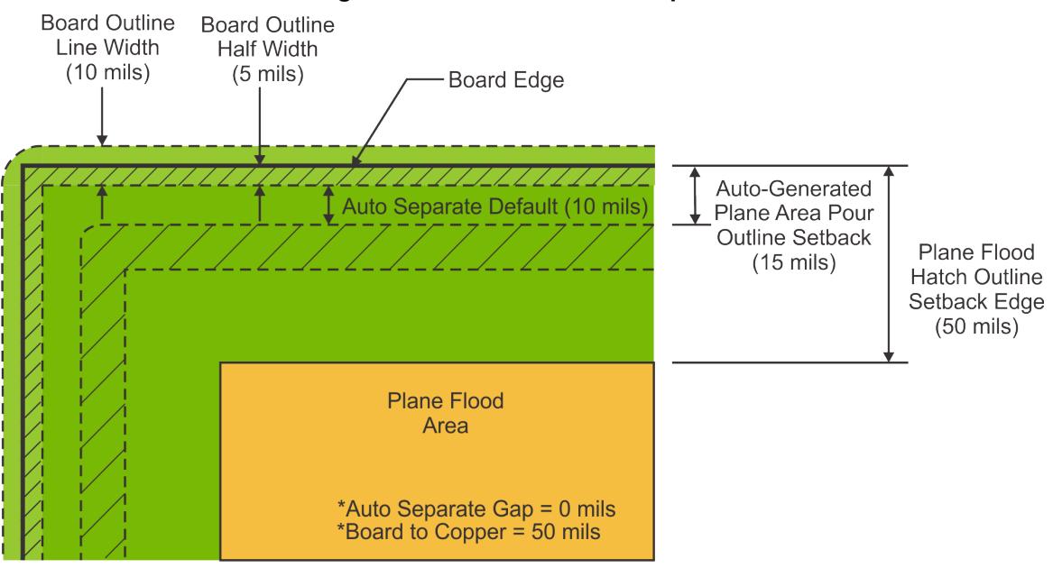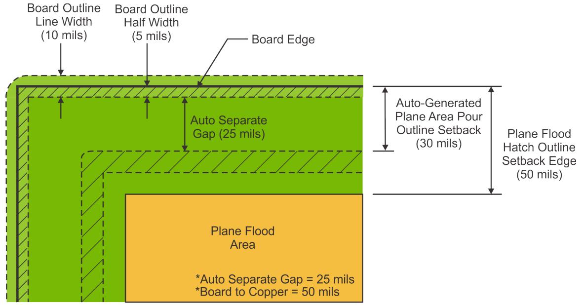当平面区域靠近板边缘时,设计规则中的板到铜间距值通常控制平面填充填充边框退缩。但是,如果确定平面区域浇注边框退缩的计算结果值大于板到铜设计规则,则它具有优先权。