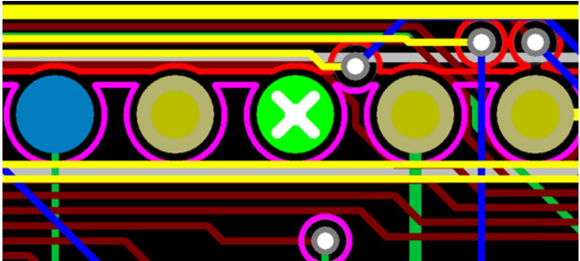 使用"活动层前置"复选框在设置 > 选项(菜单项),全局(类别),1531 页的常规子类别中查看热焊盘和反焊盘间距的更多细节。当选择此复选框时,当当前层是分割/混合平面层时,可以看到焊盘或过孔形状的小边框。如果热焊盘显示特性设置正确,热焊盘图形会出现在属于覆铜平面网络的所有管脚和过孔上。
