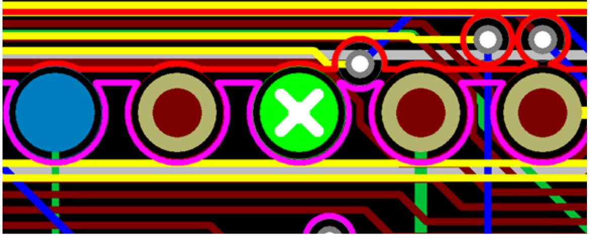 如果焊盘与铜之间的热焊盘或反焊盘间隙不正确,请参见 669 页的"自定义设计规则热焊盘"或 670 页的"自定义设计规则反焊盘"。