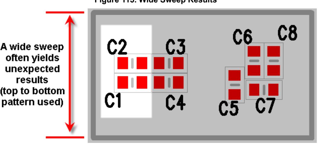 在此示例中,您接受"自动重新编号"对话框的默认单元大小设置。On x 和 On y 值设置为包含整个电路板。这产生一个长而宽的扫描。使用宽扫描的结果经常导致参考标志符的意外编号。