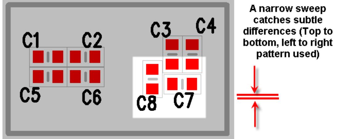 自动重新编号的结果取决于由单元大小和重新编号扫描的方向模式创建的矩阵。"自动重新编号"对话框的"单元大小"区域中使用的值允许您创建电路板的自定义重新编号扫描。