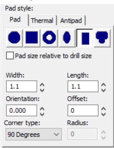 为形状: 尺寸: 层: 列表中选定的层分配焊盘样式的焊盘形状。如果选择中的层已分配了形状,点击🖱️其中一个形状按钮将重新分配。可以分配圆形、方形、环形、椭圆形、矩形或特殊形状的焊盘。