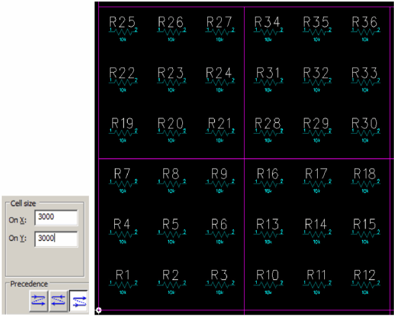 下图显示了原理图中元件采用较小单元尺寸的效果。图中绘制了单元边框以说明其工作原理。单元内的元件按优先顺序重新编号,单元也按相同顺序进行处理。