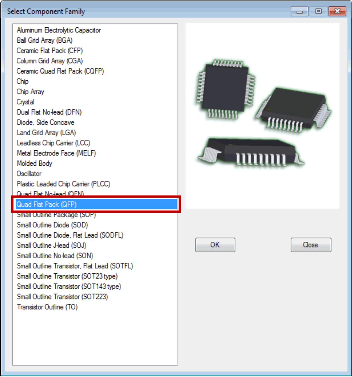 在列表中选择"Quad Flat Plack (QFP)"元件系列,然后点击🖱️OK打开计算器。