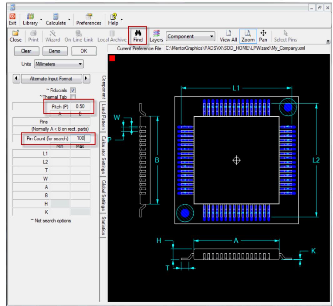 例如,点击🖱️Clear清除所有参数,然后输入⌨️制造商数据表中的一些元件尺寸,如间距(P)= 0.50 和管脚计数(用于搜索)= 100,然后选择工具栏中的"Find"按钮。只有包含该搜索条件的元件才会出现在图片上方的列表中。您在元件尺寸列中输入⌨️的内容越多,搜索结果就越精细。目标是快速浏览现有库,查看您要查找的元件是否已在库中。