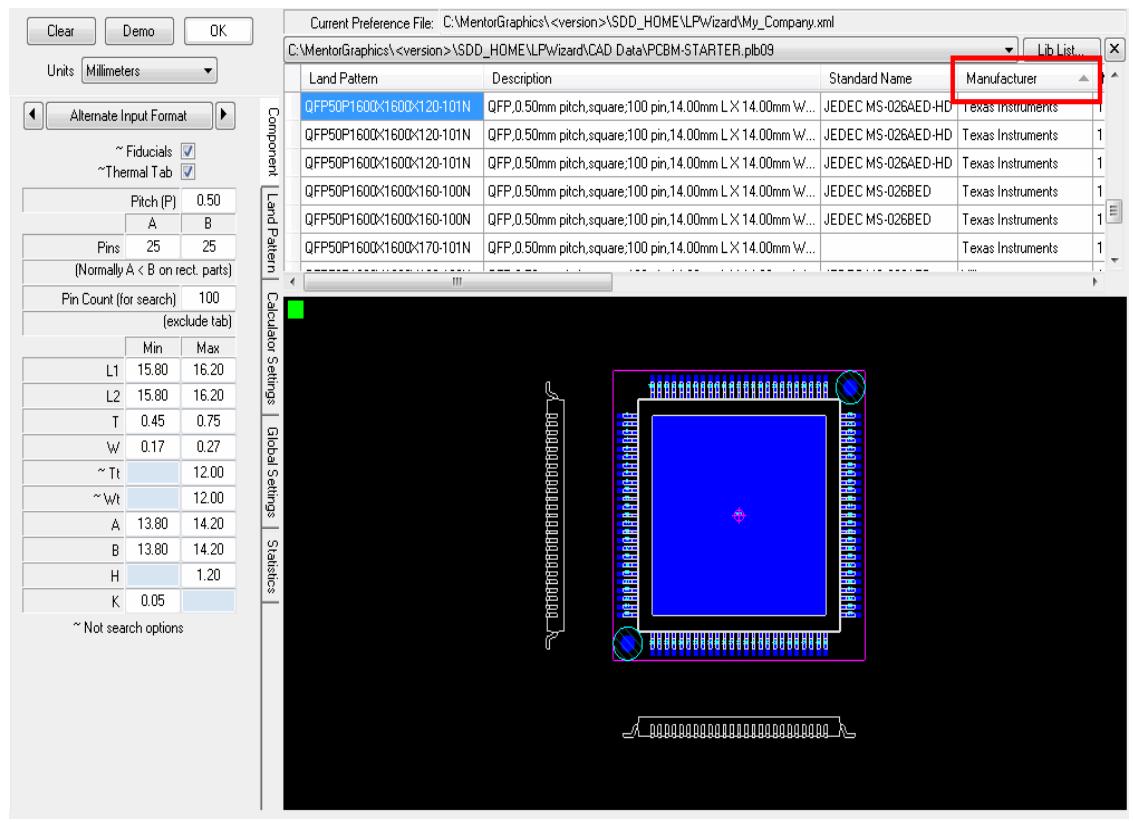 您可以通过"点击🖱️"每列的标题对属性列进行排序。例如:如果您正在搜索 Texas Instruments 焊盘图形,您将能够快速滚动到该制造商,以查看 PLB 文件中的尺寸数据是否与数据表上的元件尺寸匹配。当您找到要查找的正确元件时,"双击"该行项目以在计算器中打开焊盘图形。