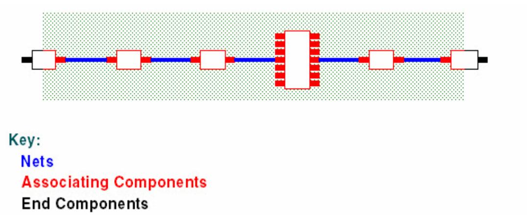 您可以将由分立元件连接的多个网络关联起来,创建一个电气网络,您可以像对单个网络一样对其应用规则。电气网络的总长度是其组成网络和分立元件长度的总和。