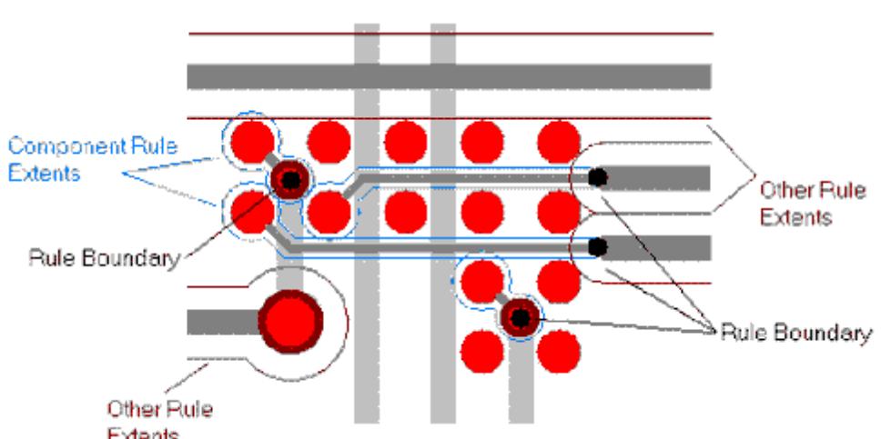 例外情况:存在一种特殊情况,组件边界不仅仅根据设计规则计算。例如,在 SailWind Router 中,您使用窄导线宽度退出细间距 BGA,但导线不会自动在组件边界边缘退出组件规则。您决定何时使用"切换规则" 命令退出组件规则,根据设计层次结构中最相关的规则更改为更大的导线宽度。在这种情况下,您可以扩展组件规则远离组件并超出组件边界的计算区域。
