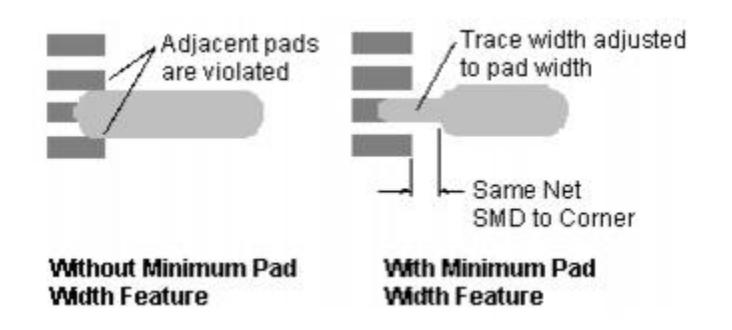 SailWind Router 功能会自动将导线宽度减小到焊盘,前提是导线宽度在最小和最大宽度规则范围内(图 30) 。导线的布线规则必须具有小于或等于焊盘宽度的最小宽度;否则 SailWind Router 不会使用该功能并且不会完成导线。