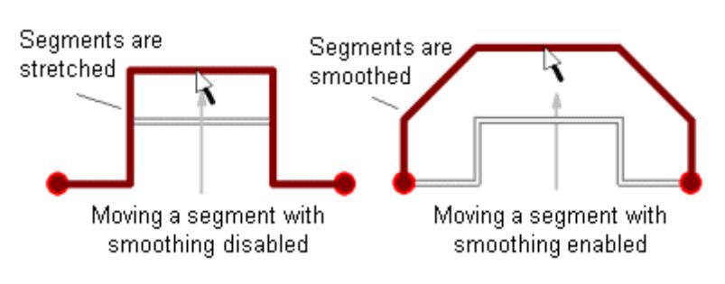 如果选中✅"平滑相邻线段"复选框(选项对话框 > 布线类别 > 常规子类别),SailWind Router 会在您移动任何导线对象(拐角除外)时平滑相邻导线段。移动拐角时不会平滑相邻线段。
