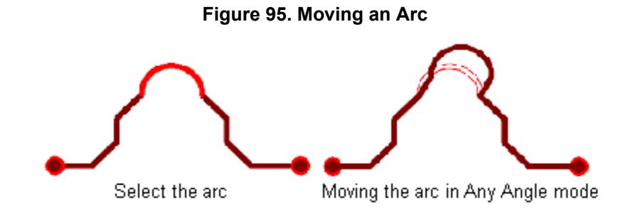 将鼠标移动到圆弧的新位置,点击🖱️完成移动。如果选中✅"平滑相邻线段"复选框(选项对话框 > 布线类别 > 常规子类别),SailWind Router 会在您移动与圆弧相邻的线段时平滑相邻导线段